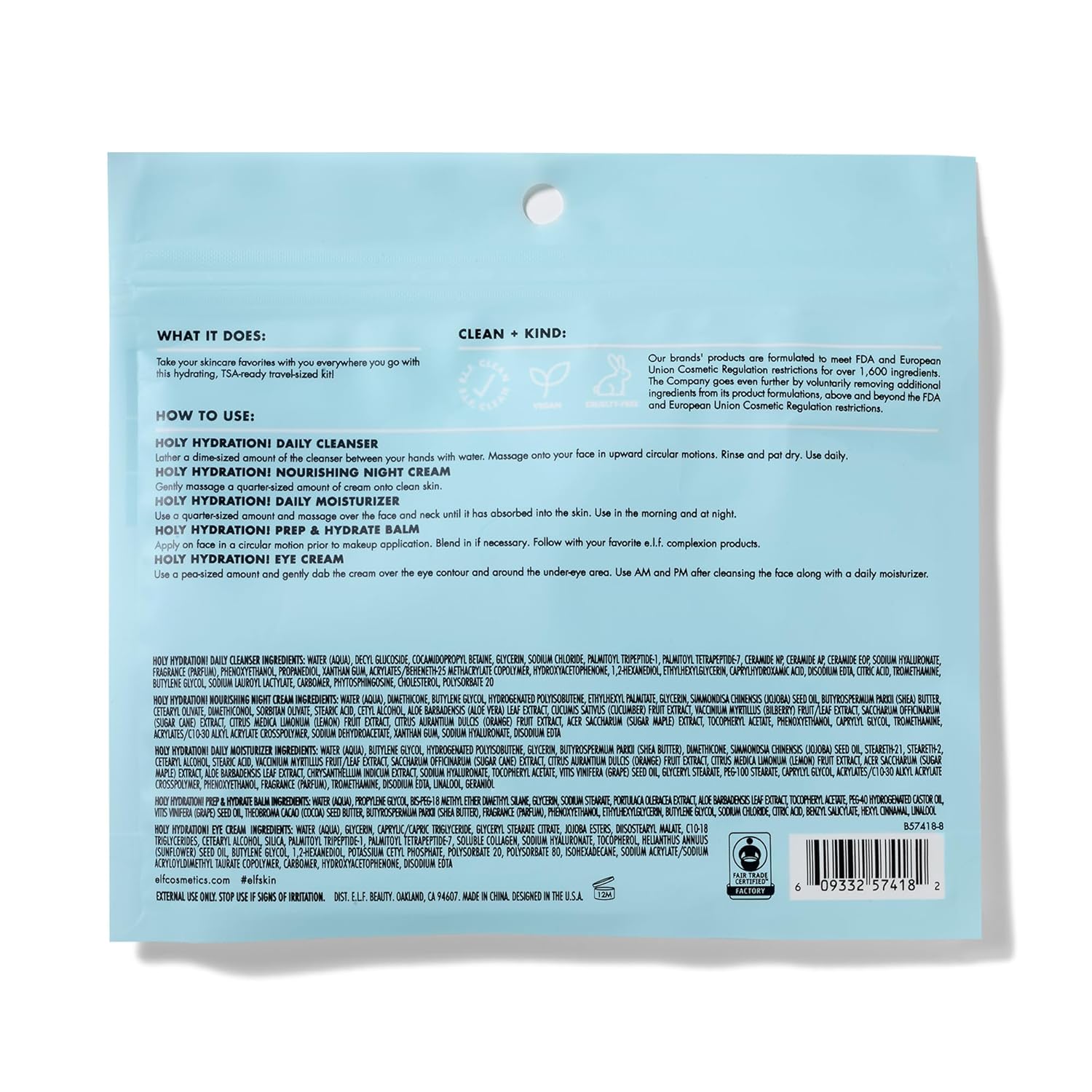 What it is: Five hydrating skincare favorites packed in one travel-sized kit. Why we love: A complete skincare routine in one kit TSA-friendly sizes Moisturizing, vitamin-infused formulas Key Ingredients: Citric Acid - Gently exfoliates and evens skin tone Cucumber Extract - Calms skin and reduces puffiness Shea Butter - Nourishes and softens skin Aloe Vera - Soothes and provides anti-inflammatory benefits Jojoba Oil - Locks in moisture Vitamin E - Brings a refreshing moisture boost A skincare routine that’s ready to go where you are! This convenient travel-sized kit includes five moisturizing skincare faves that will deeply nourish, brighten, and soothe all skin types. Each product packs a punch and is infused with skin-quenching ingredients that will hydrate your skin from the inside out. Kit includes: Daily Face Cleanser (30ml) - A gentle daily cleanser infused with Citric Acid that removes dirt, impurities, and makeup while brightening skin. Prep and Hydrate Balm (6g) - A water-based balm stick that instantly hydrates, improves skin texture, and preps skin for makeup application. Daily Hydration Moisturizer (25 ml) - A lightweight cream moisturizer infused with essential nutrients to deeply nourish the skin. Nourishing Night Cream (15g) - A soothing and calming cream that revitalizes the skin overnight. Illuminating Eye Cream (7g) - A rich and nourishing eye cream that reawakens your delicate eye area. All e.l.f. products are made from skin-loving ingredients you want, minus the toxins you don’t—all at good-for-you prices. All e.l.f. products are 100% vegan, cruelty-free, and leaping bunny certified. Because kindness is chic. "