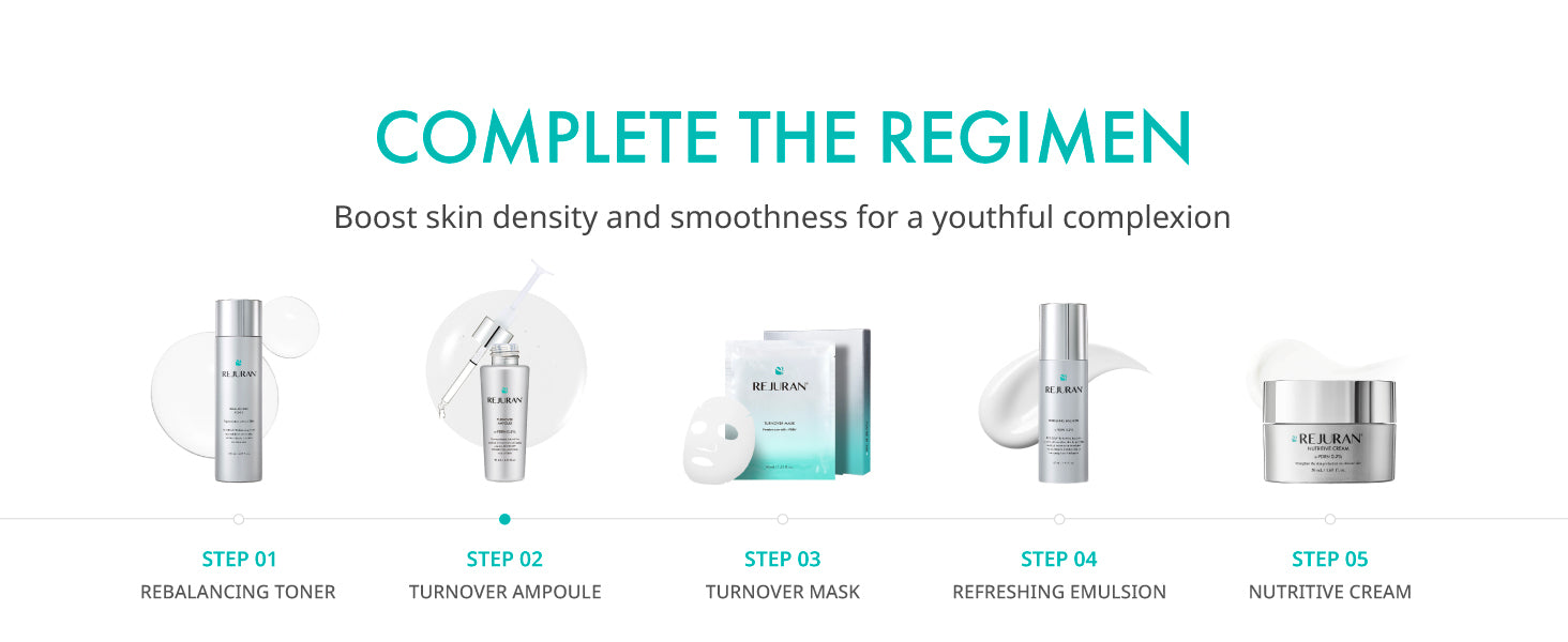 • The Turnover Ampoule is formulated with Salmon DNA, the same core ingredient source used in REJURAN’s Skin Boosters and delivers visible results as a home-care version with no downtime required.