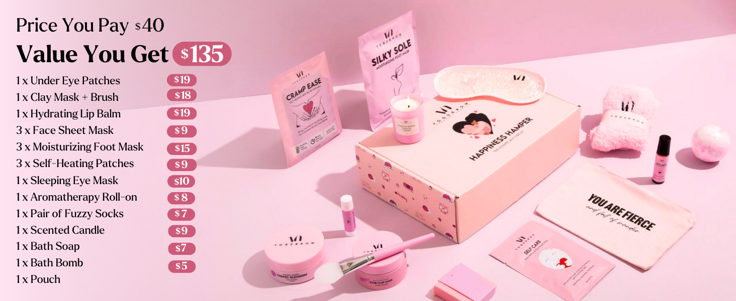 This makes one of the best spa gifts for women! Introducing Happiness Hamper Self Care Kit by VogueNow. This kit is curated with love and care for all the gorgeous women out there! It's time for you to take a little time and indulge yourself in self-love and care because you deserve it!